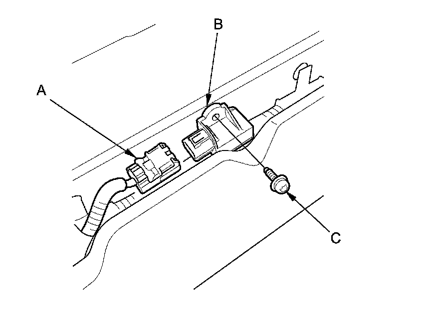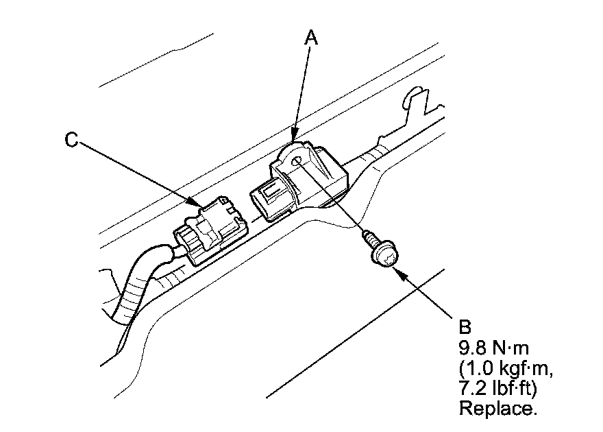 1. Install the rear safing sensor (A) with a new TORX bolt (B), using a TORX T30 bit, then connect the floor wire harness 2P connector (C) to the rear safing sensor.