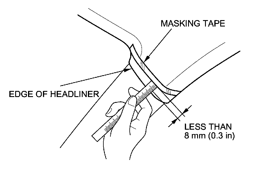 To prevent the side curtain airbag from deploying and damaging the pillar trim, the overlap between the headliner and pillar trim must be less than 8 mm (0.3 in). To check the overlap, do this: