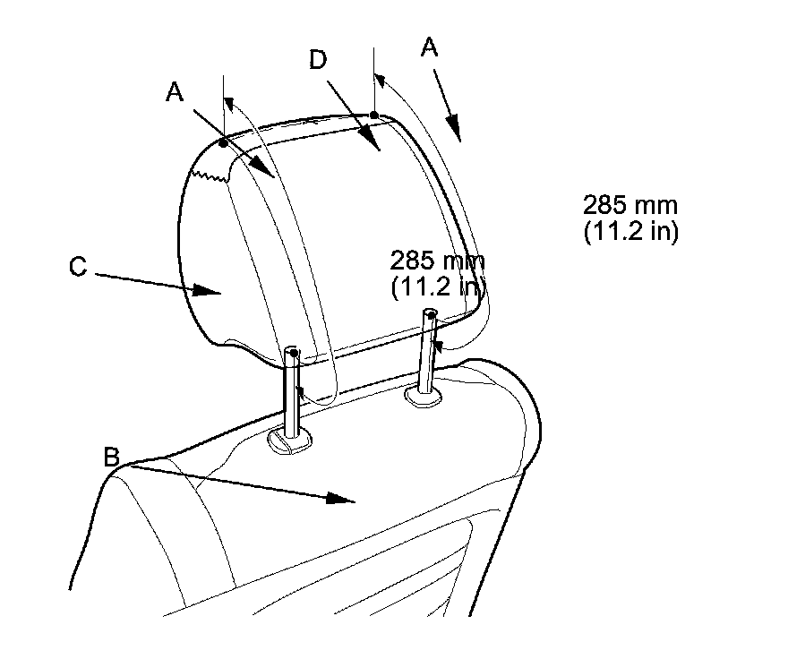 4. Make marks (A) on both sides at 285 mm (11.2 in) upward from the roots of the head restraint frame (B) along the back of the head restraint (C) surface. Make a center of these points as a datum point (D).