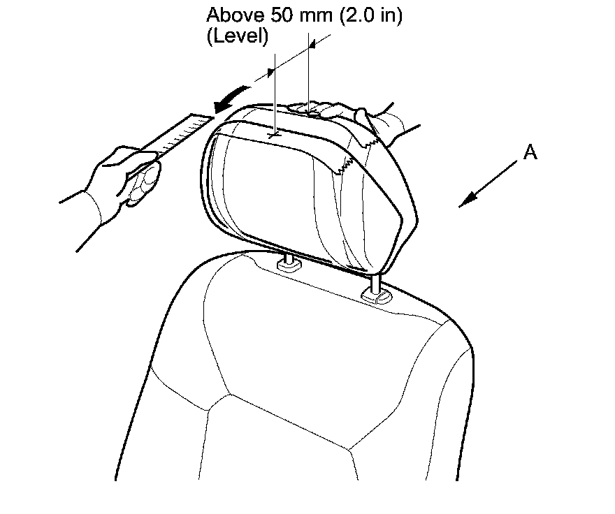 5. Push the head restraint (A) forward, and measure its free horizontal movement. The head restraint should move more than 50 mm (2.0 in) without resistance. If it is less than 50 mm (2.0 in), or the head restraint doesn't move smoothly, replace the seat-back frame Front Seat Frame Replacement.