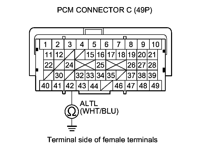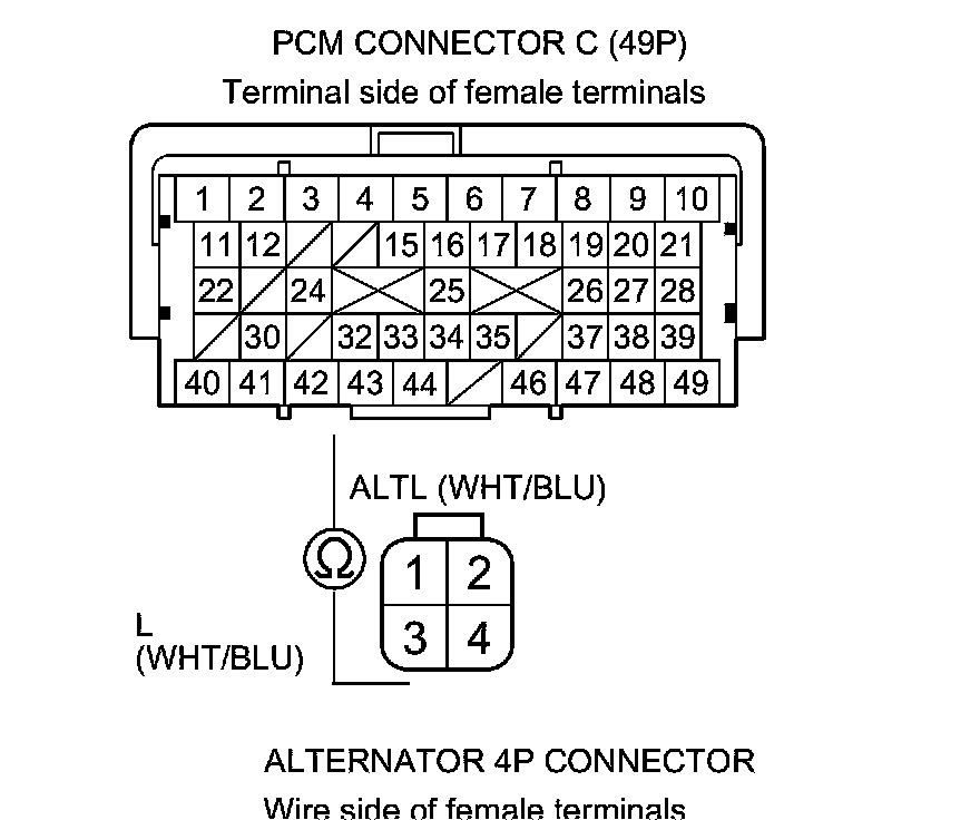 25. Check for continuity between PCM connector terminal C42 and alternator 4P connector terminal No. 3.