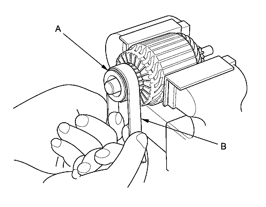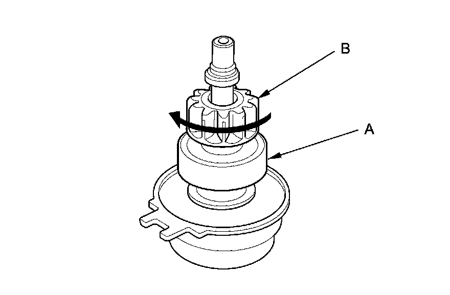 15. Hold the overrunning clutch (A), and turn the drive gear (B) in the direction shown to make sure it turns freely. Also make sure the drive gear locks in the opposite direction. If it does not lock, replace the overrunning clutch assembly.