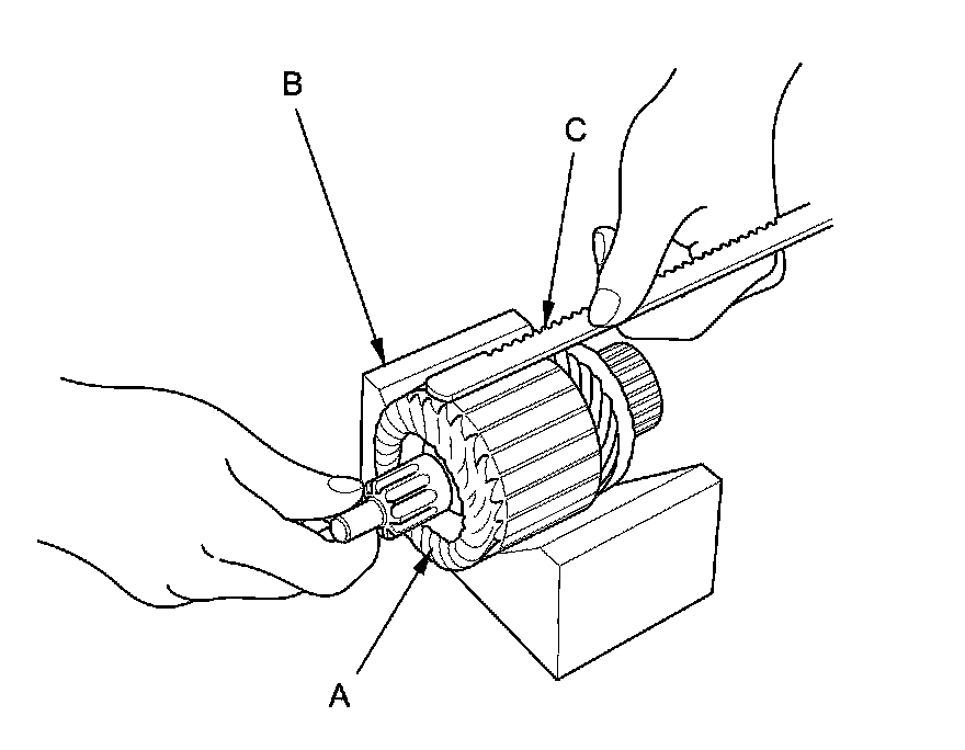 12. Place the armature (A) on an armature tester (B). Hold a hacksaw blade (C) on the armature core. If the blade is attracted to the core while the core is turned, the armature is shorted. Replace the armature.
