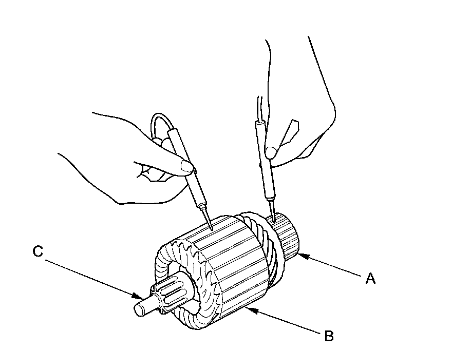 13. Use an ohmmeter to check for continuity between the commutator (A) and the armature coil core (B), and between the commutator and the armature shaft (C). If there is continuity, replace the armature.