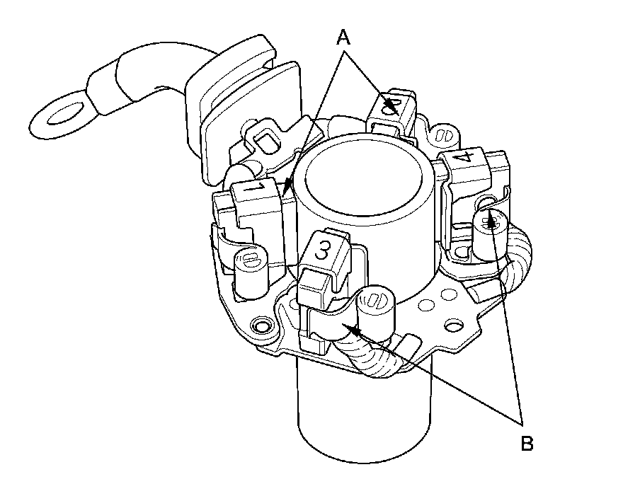 18. Check for continuity between the (+) brush holders (A) and the (-) brush holders (B). If there is continuity, replace the brush holder assembly.