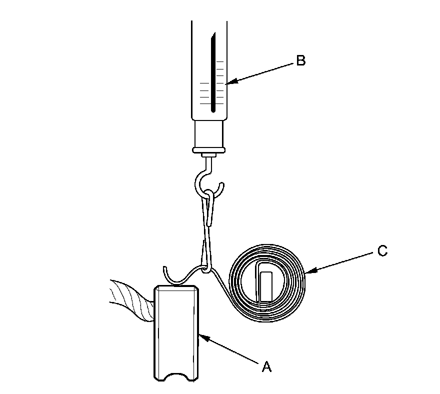 19. Insert the brush (A) into the brush holder, and bring the brush into contact with the commutator, then attach a spring scale (B) to the spring (C). Measure the spring tension at the moment the spring lifts off the brush. If it is not within the standard, replace the brush holder assembly.