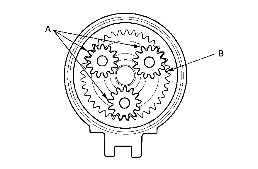 20. Check the planetary gears (A) and internal ring gear (B). Replace them if they are worn or damaged.