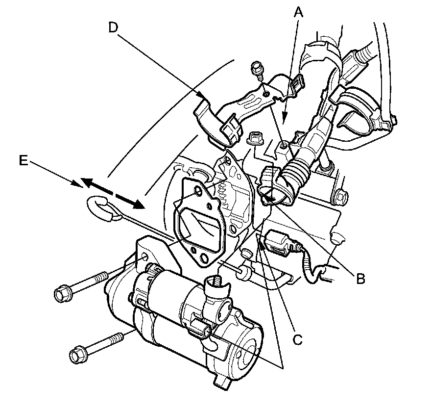 3. Connect the positive starter cable (D) and the S terminal connector (E) to the starter, then install the harness clamp (F). Make sure the crimped side of the ring terminal faces away from the starter when you connect it.