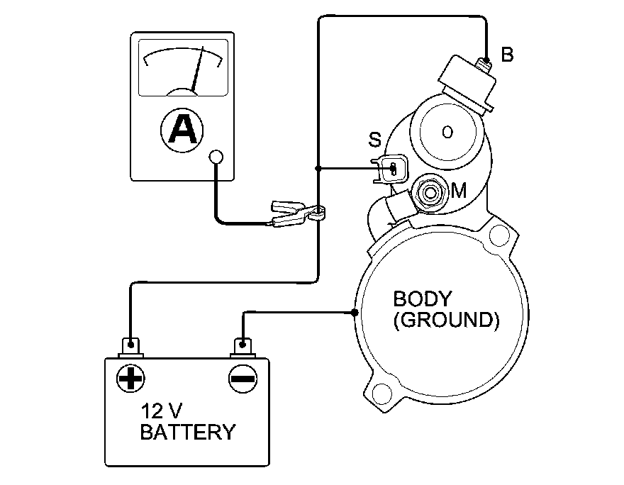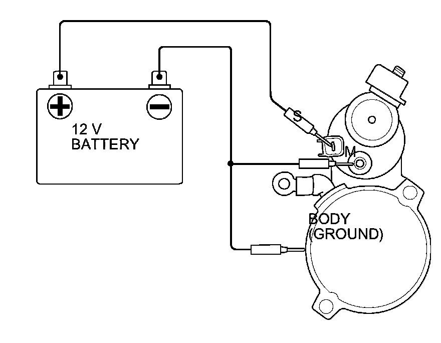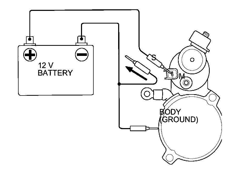 5. Connect the battery as shown. Make sure you disconnect the starter motor wire from the M terminal. If the starter pinion moves out, it is working properly.