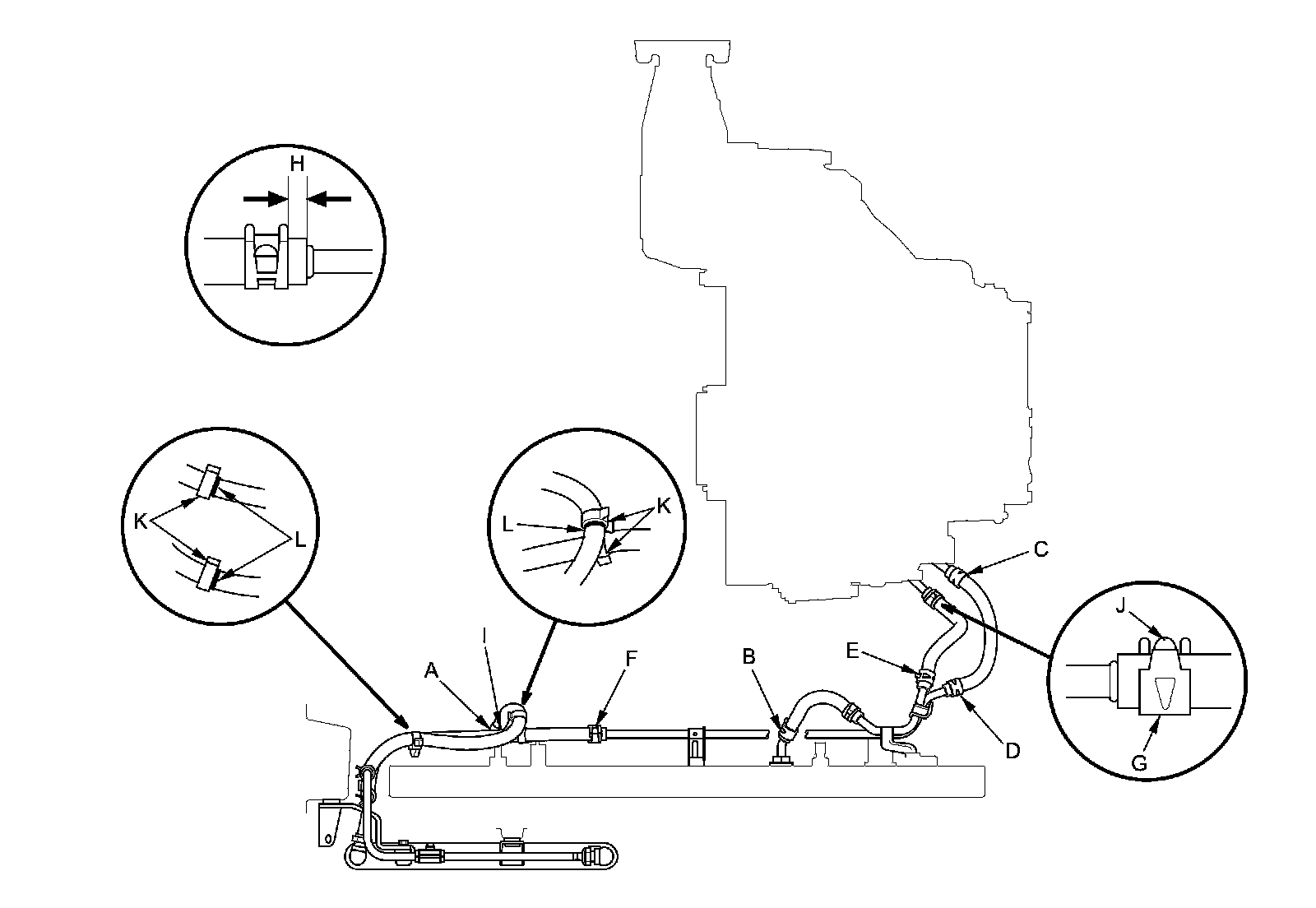 3. Secure the ATF cooler hose with the clamps (K) at the marking (L).