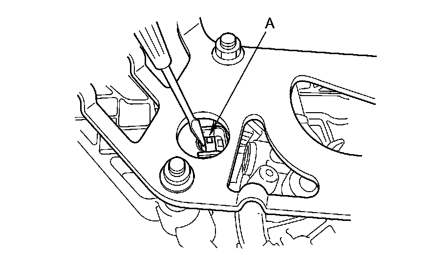 5. Release the lock tabs (A) retaining the shift lock solenoid through the left shift lever mounting bracket using thin blade screwdrivers.