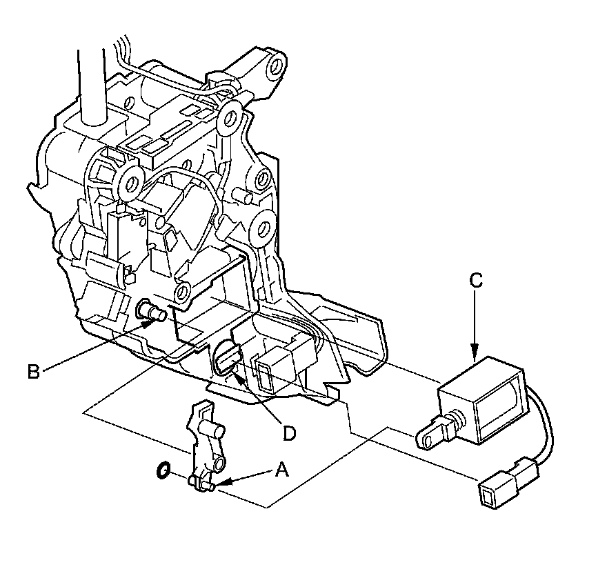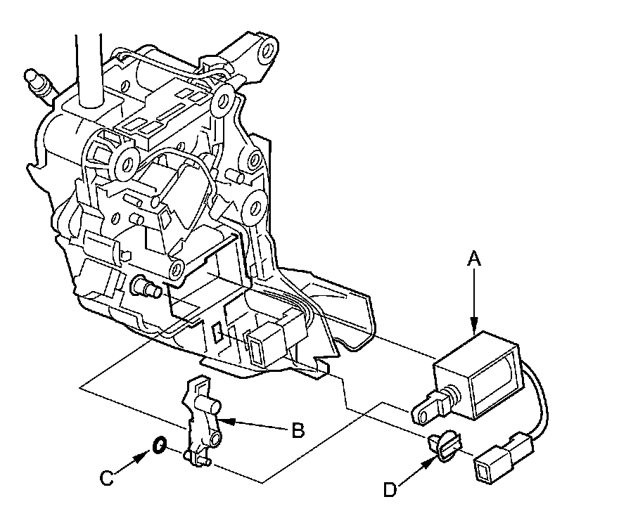 6. Remove the shift lock solenoid (A), the shift lock stop (B), the shift lock stop cushion (C), and the connector clamp (D).
