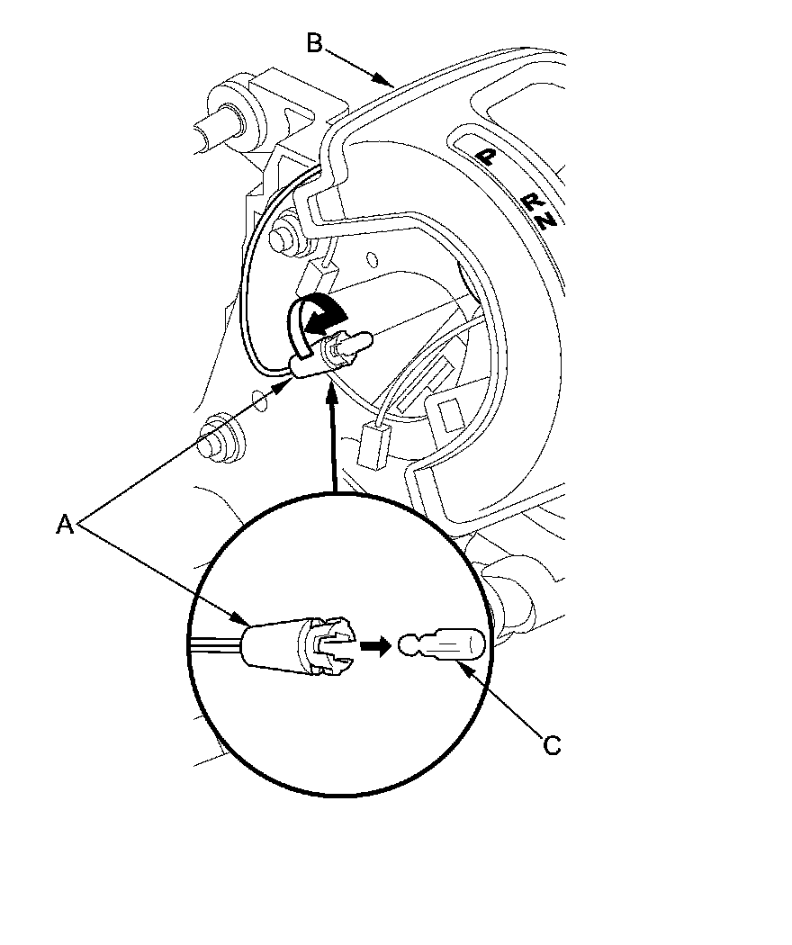 4. Remove the park pin switch (A) by expanding its locks (B) from the shift lever. Remove the A/T gear position indicator panel light harness/park pin switch/D3 switch connector harness (C).