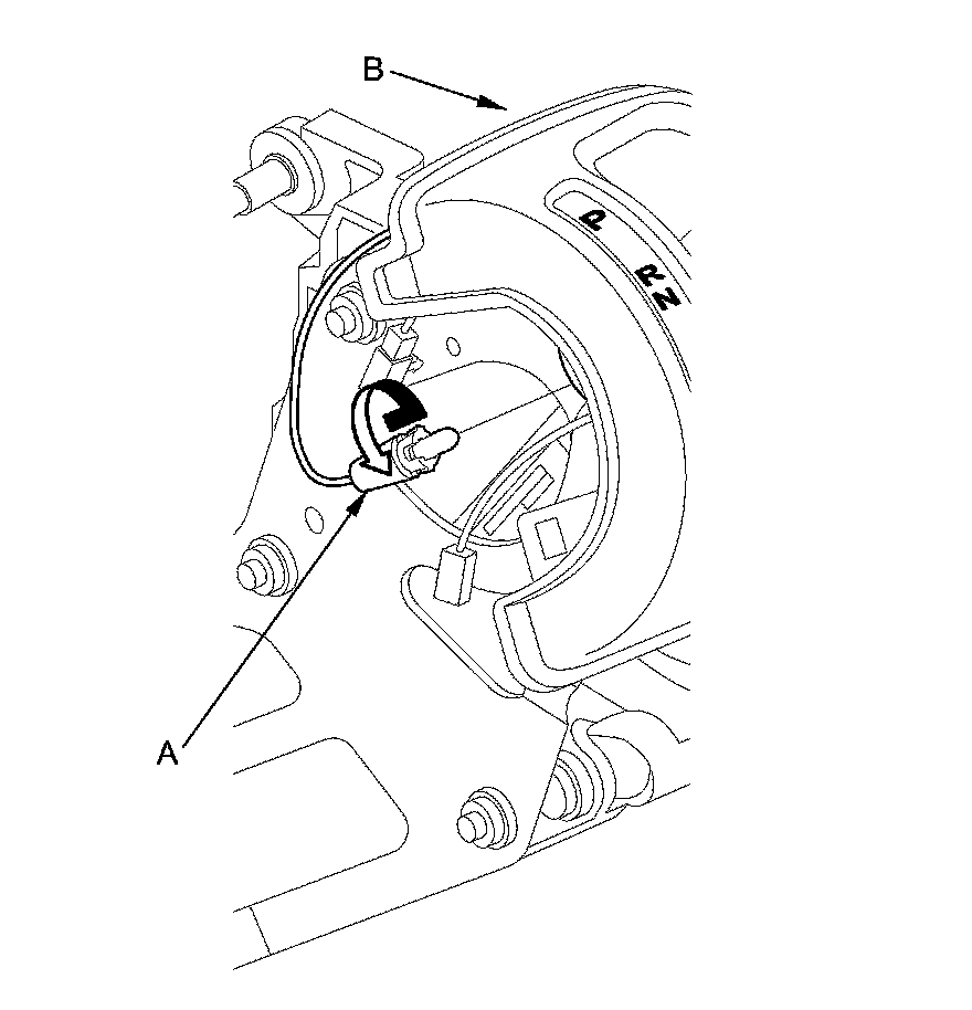 7. Install the A/T gear position indicator panel light socket (A) in the A/T gear position indicator panel (B).