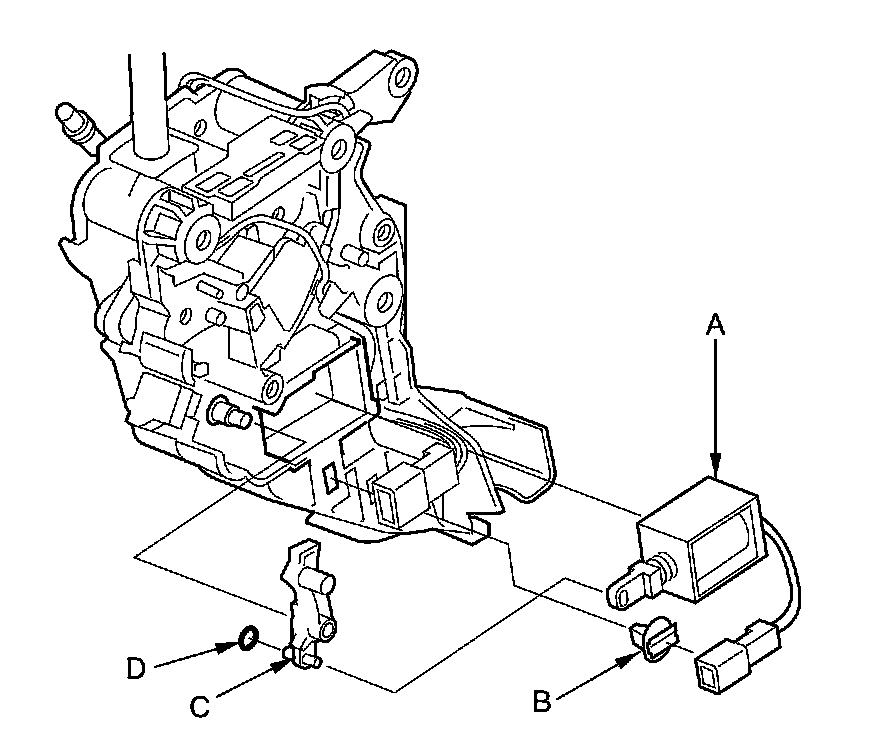 6. Remove the shift lock solenoid (A), the connector clamp (B), the shift lock stop (C), and the stop cushion (D).