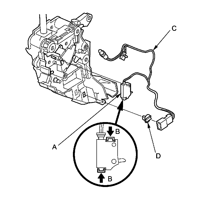 7. Remove the park pin switch (A) by expanding its locks (B) from the shift lever bracket. Remove the A/T gear position indicator panel light harness/park pin switch/D3 switch connector harness (C) and connector clamp (D).