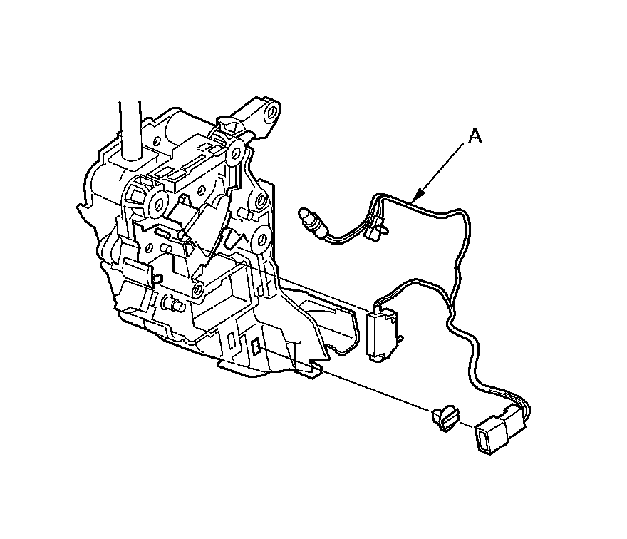 5. Release the lock tabs (A) retaining the shift lock solenoid through the left shift lever mounting bracket using thin blade screwdrivers.