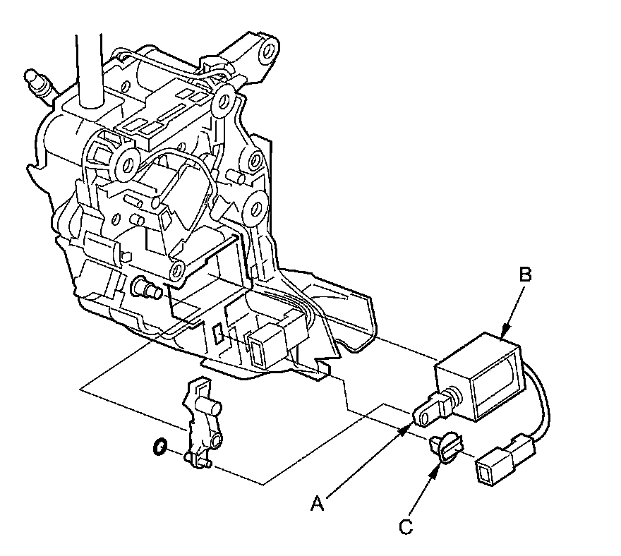 12. Install the shift lock solenoid (B), and install the connector clamp (C).