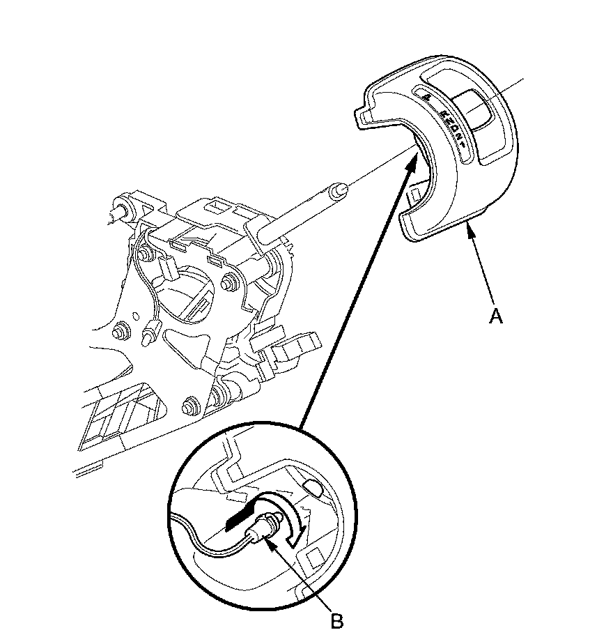 13. Install the A/T gear position indicator panel (A), and install the A/T gear position indicator panel light socket (B) in the A/T gear position indicator panel.