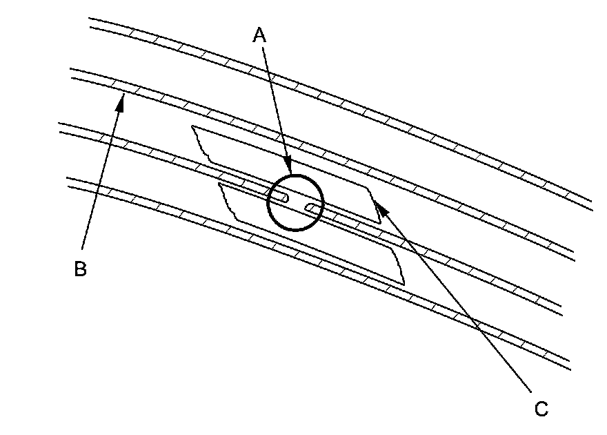 2. Carefully mask above and below the broken portion of the defogger wire (B) with cellophane tape (C).