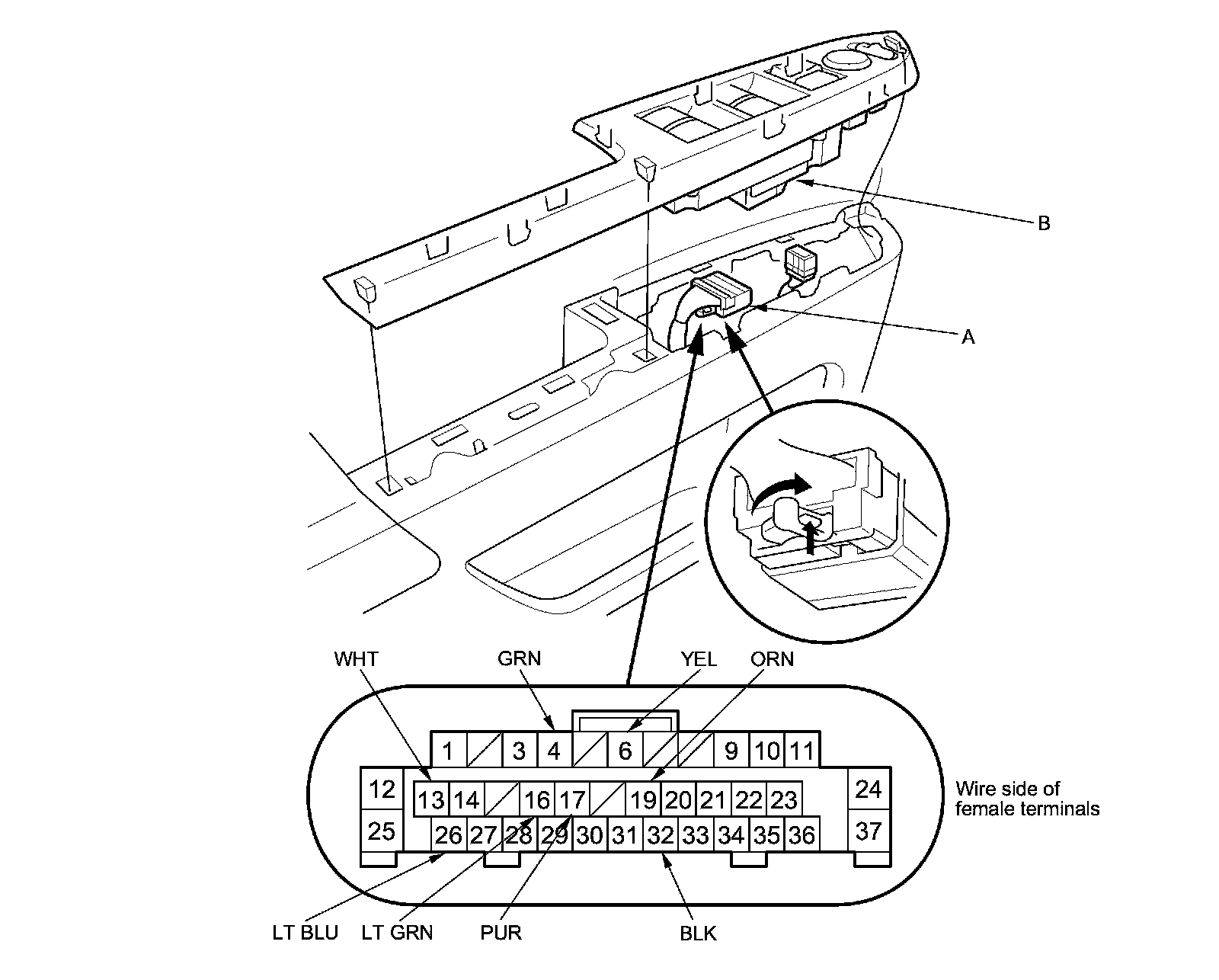 3. Disconnect the 37P connector (A) from the power window master switch (B).