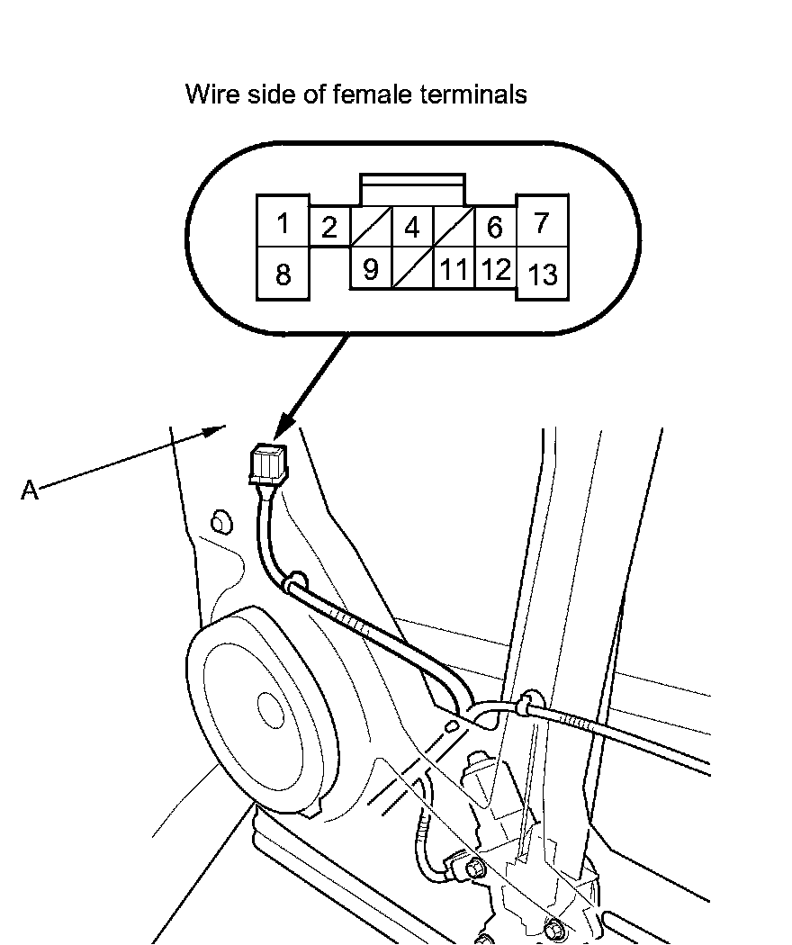 1. Remove the rear door panel Service and Repair, and disconnect the rear door wire harness 13P connector (A) from the rear door subharness.