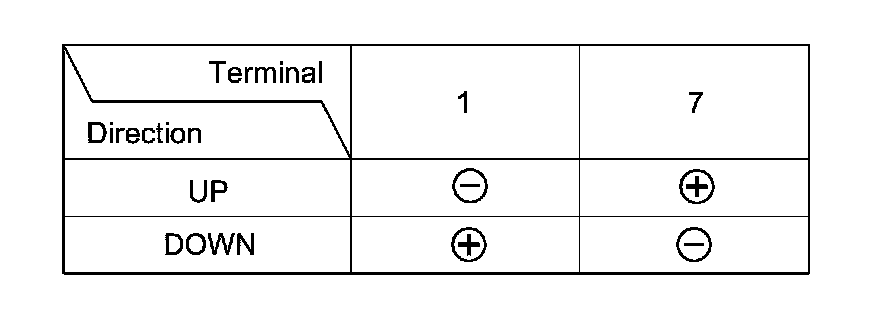 2. At the rear door wire harness 13P connector, test the power window motor in each direction by connecting battery power and ground according to the table. When the motor stops running, disconnect one lead immediately.