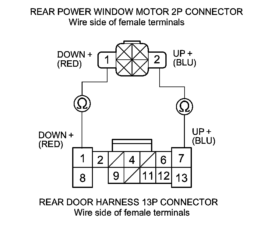 5. Check for continuity between rear power window motor 2P connector terminals No. 1 and No. 2 and the door wire harness 13P connector terminals No. 1 and No. 7 respectively. There should be continuity.