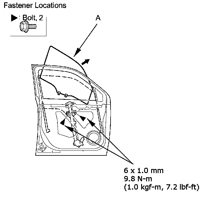 4. Carefully move the glass (A) until you can see the bolts, then remove them. Carefully pull the glass out through the window slot. Take care not to drop the glass inside the door.