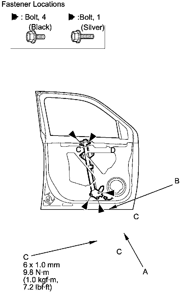 6. Remove the bolts (C), and loosen the bolt (D). Remove the regulator through the hole in the door.