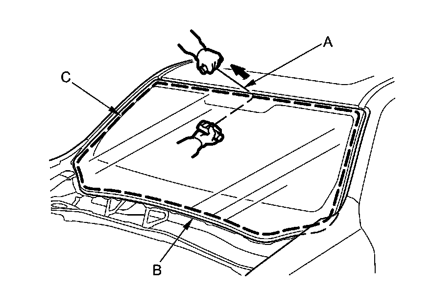 Carefully cut through the rubber dam and adhesive (C) around the entire windshield.