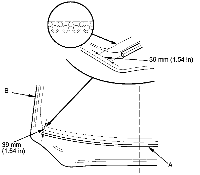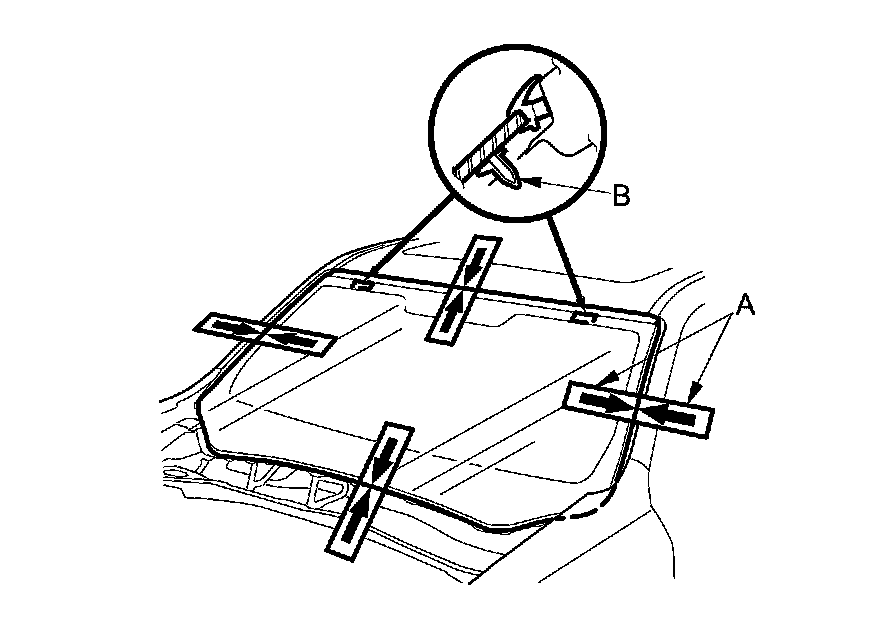 2. Remove the molding (A) from the upper edge of the windshield (B). If necessary, cut the molding with a utility knife.