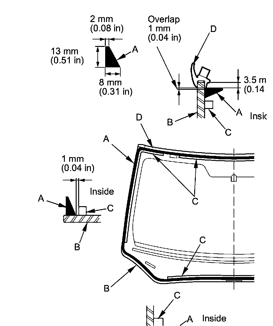 17. With a sponge, apply a light coat of glass primer around the edge of the windshield (A) between the dams (B, C) and molding (D) as shown, then lightly wipe it off with gauze or cheesecloth: