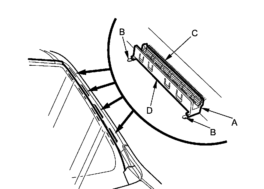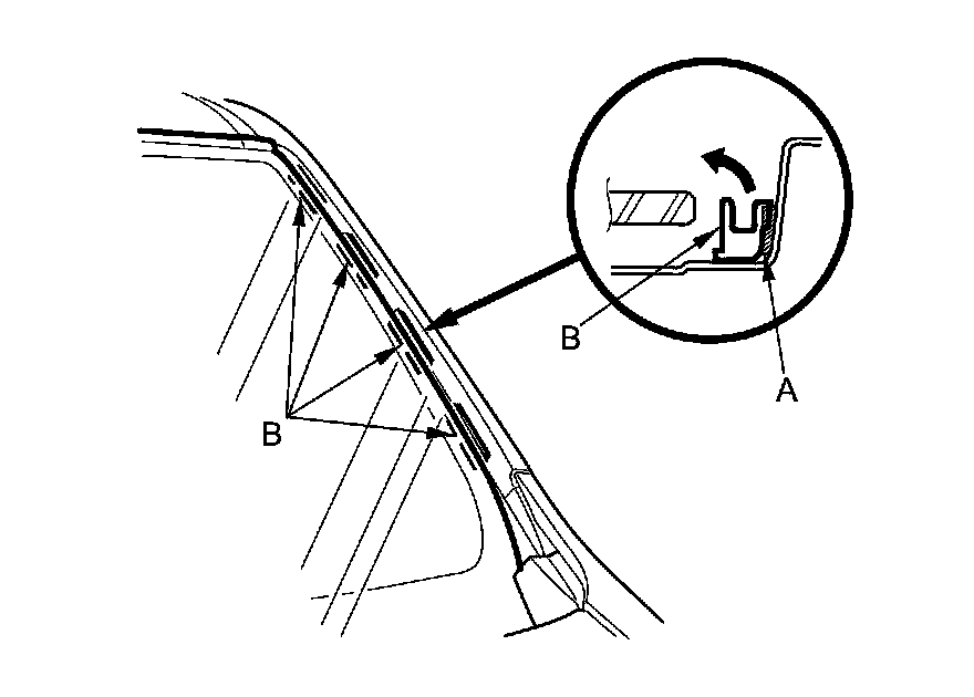 1. Carefully insert a trim tool under the windshield side trim next to the clip (B), then pry the trim up to release the clip.