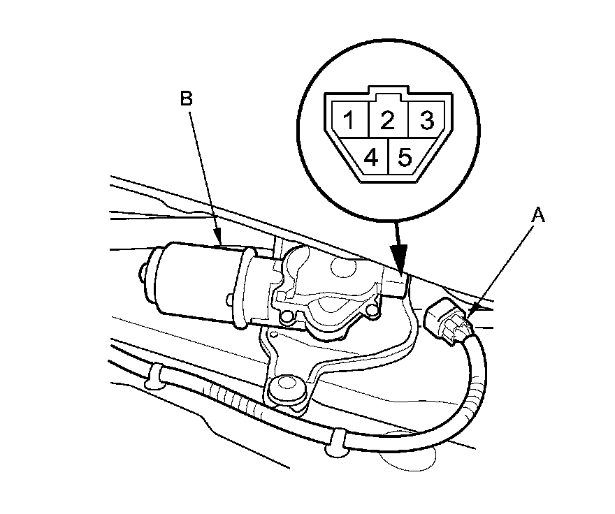 3. Disconnect the 5P connector (A) from the windshield wiper motor (B).