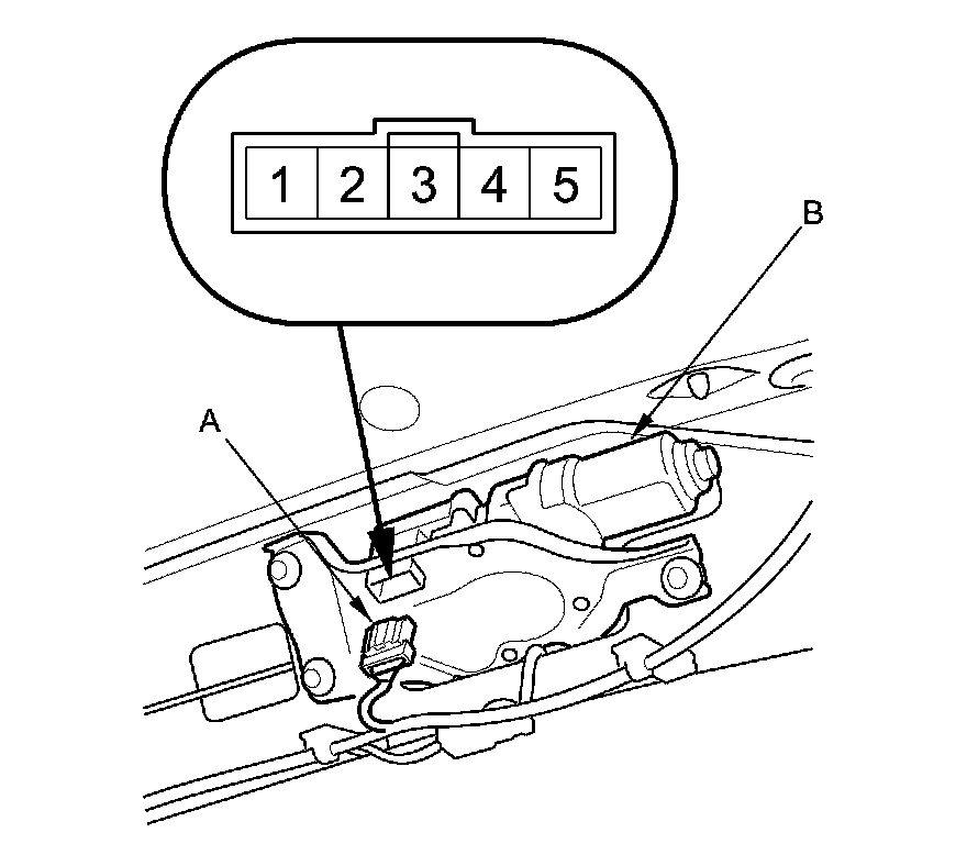 3. Test the motor by connecting battery power to terminal No. 4 and ground to terminal No. 5 of the wiper motor. The motor should run. If the motor does not run or fails to run smoothly, replace the motor Rear Window Wiper Motor Replacement.