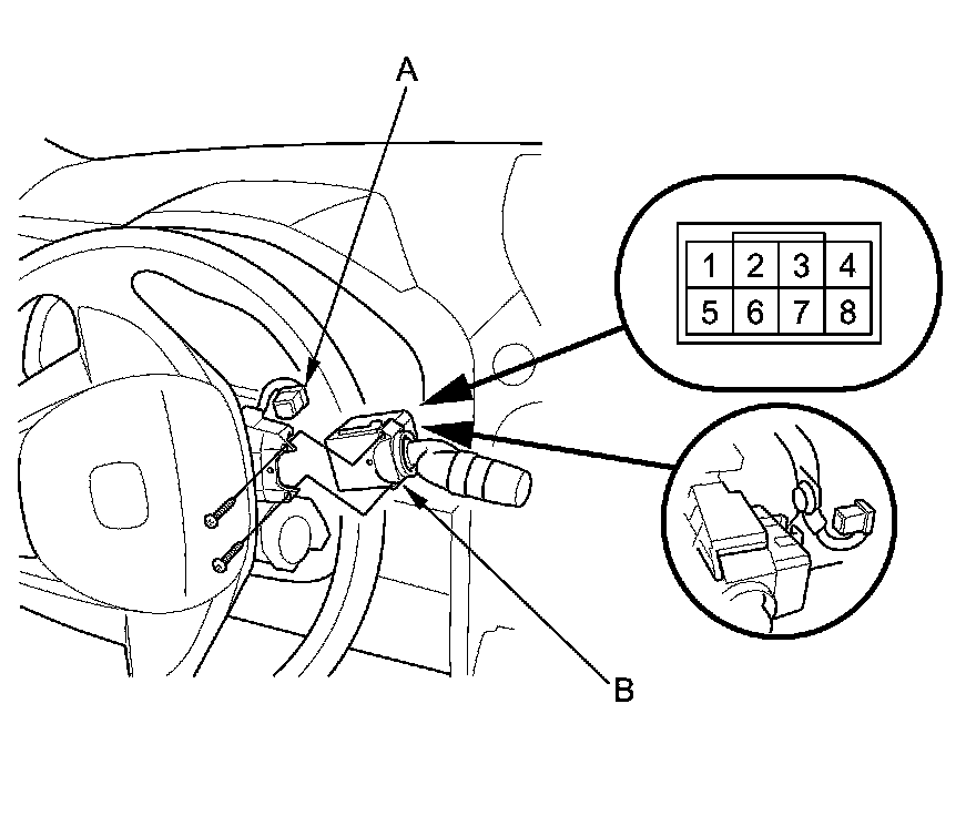 2. Disconnect the dashboard wire harness 8P connector (A) from the wiper/washer switch (B).
