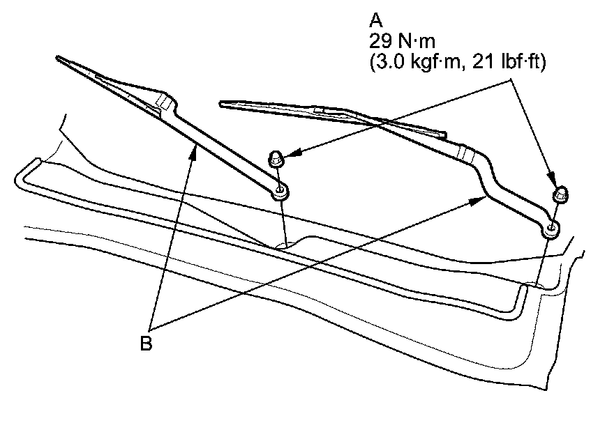 1. Open the hood. Remove the nuts (A) and the windshield wiper arms (B).
