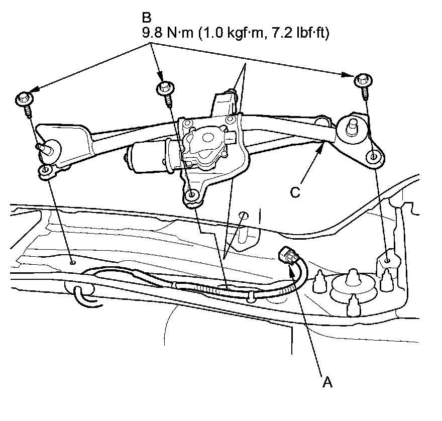 4. Remove the three bolts (B) and the wiper linkage assembly (C).