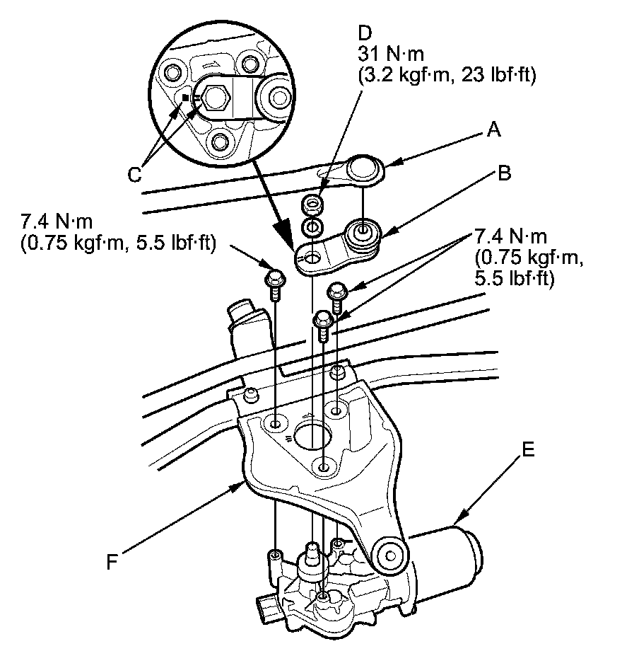 7. Remove the three bolts, and separate the wiper motor from the linkage (F).