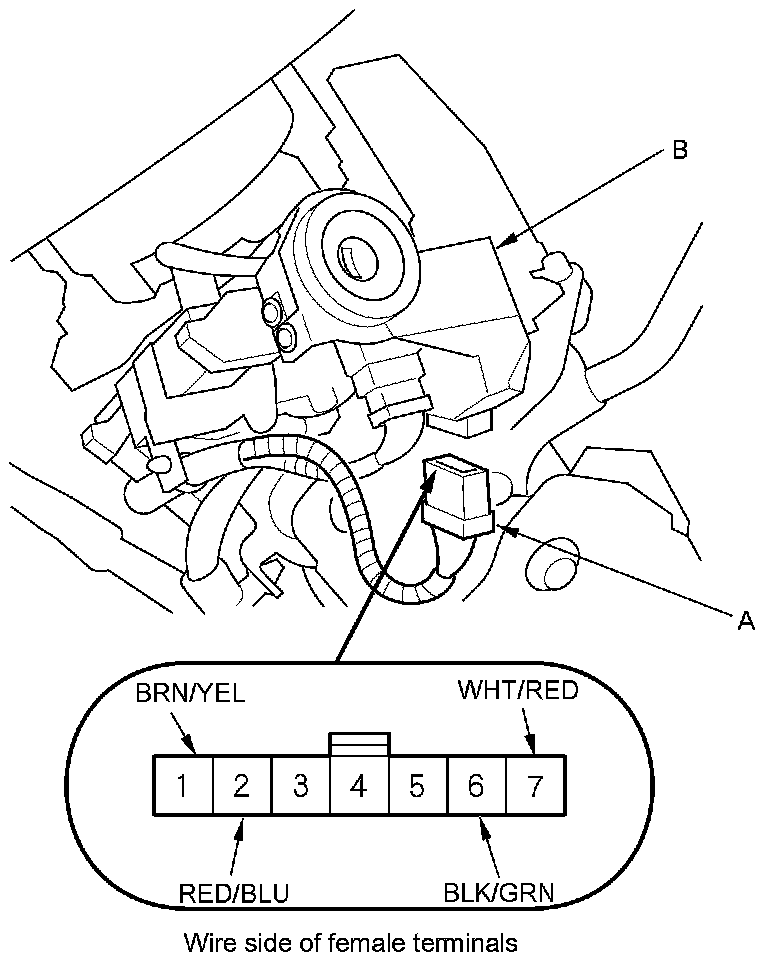 3. Disconnect the 7P connector (A) from the immobilizer control unit-receiver (B).
