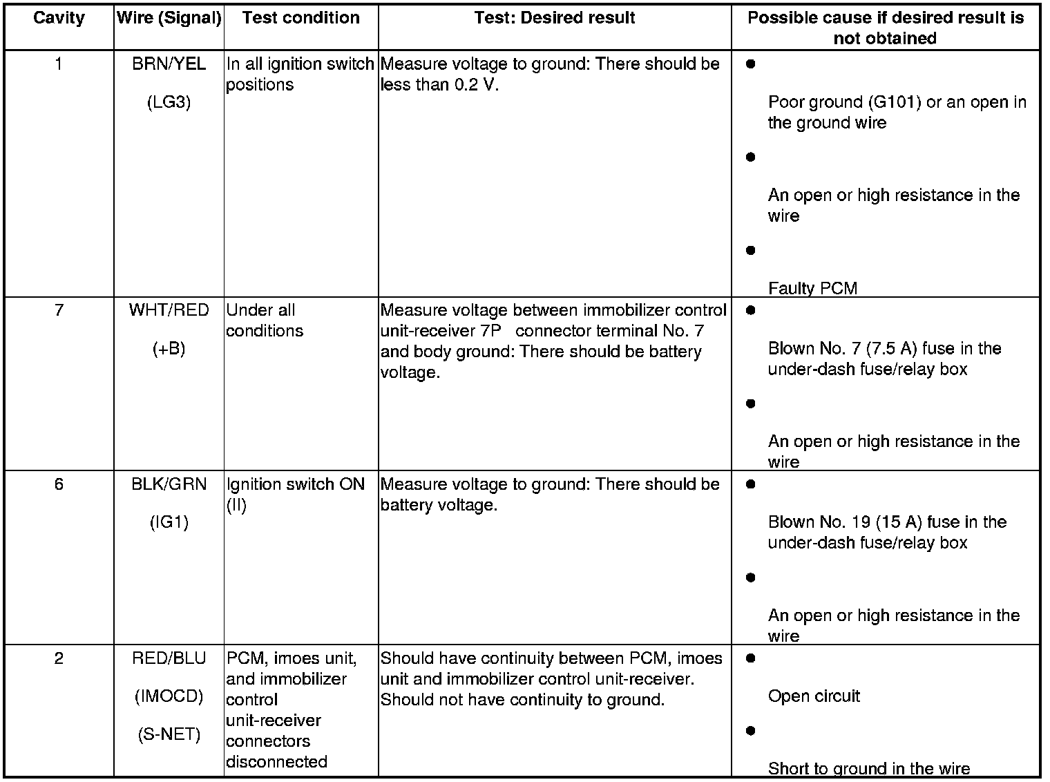5. Reconnect the connector to the immobilizer control unit-receiver, and do the following input tests: