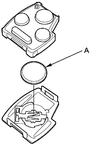 4. Replace the transmitter battery (A) with a new one, and try to lock and unlock the doors with the transmitter by pressing the lock or unlock button at least 10 times.