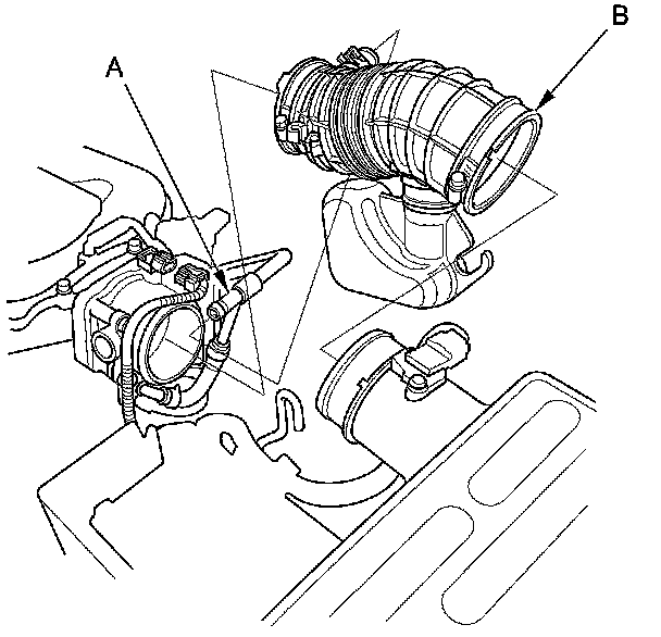 6. Disconnect the breather pipe (A), then remove the air intake duct (B).