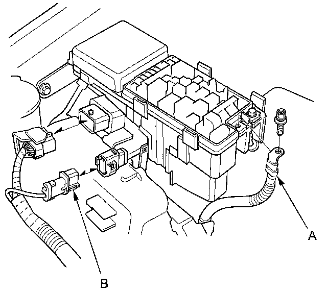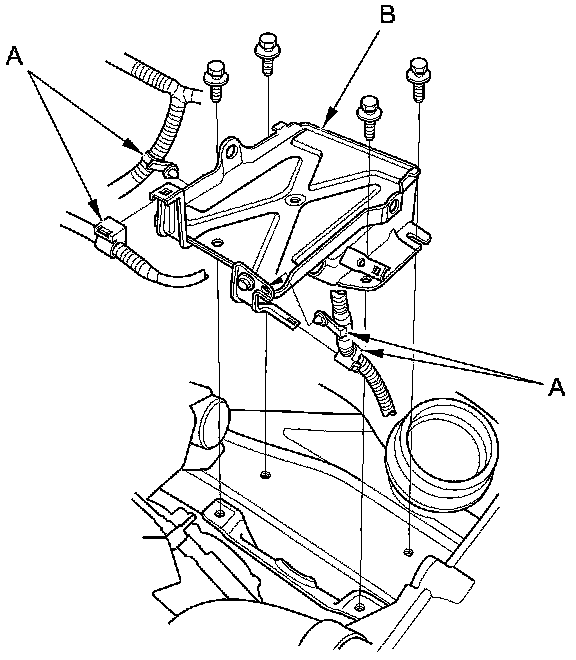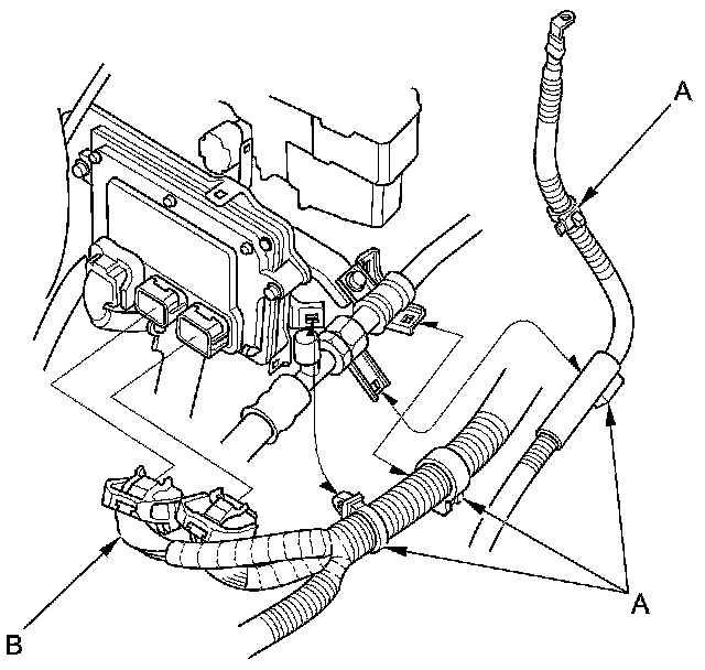 20. Remove the harness clamps (A), then disconnect the two PCM connectors (B).