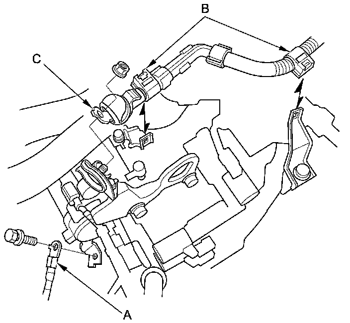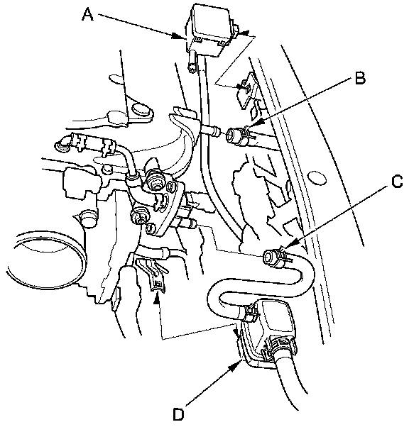 12. Disconnect the EVAP canister hose (C), then remove the EVAP purge joint (D).