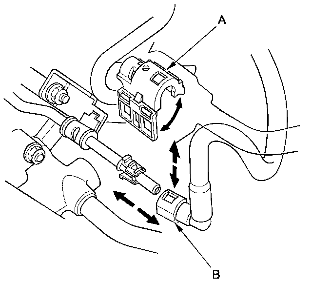 10. Remove the quick-connect fitting cover (A), then disconnect the fuel feed hose (B) Fuel Line/Quick-Connect Fitting Removal.