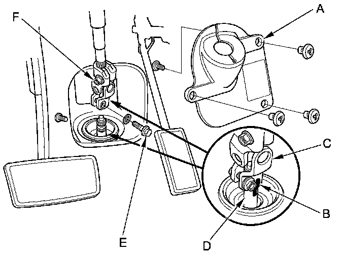 15. Make a reference mark (B) across the steering joint (C) and steering gearbox pinion shaft (D). Remove the steering joint bolt (E), and loosen the steering joint bolt (F), then disconnect the steering joint from the steering gearbox pinion shaft.