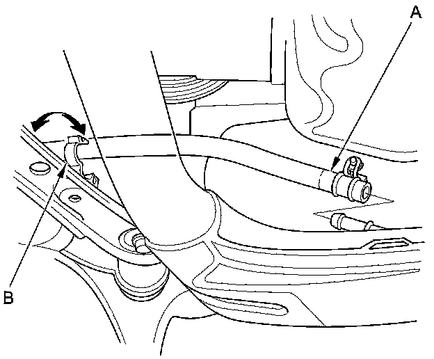 40. Unclamp the power steering fluid line clamp (B) on the front subframe.