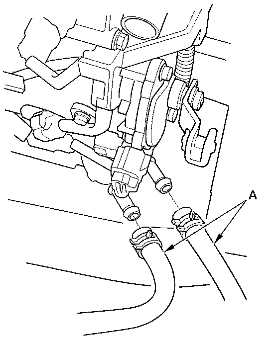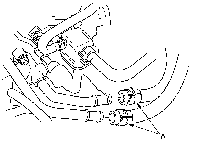 48. Disconnect the ATF cooler hoses (A) from the transmission, then plug the ATF cooler hoses and lines.